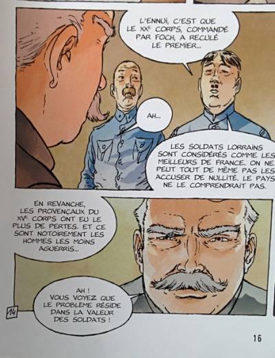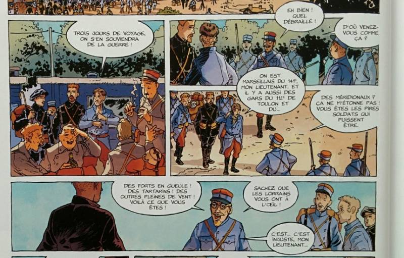 D'autres ambiances et échanges nous sont rapportés dans la série 14-18 par CORBEYRAN / ETIENNE LE ROUX / LOI CHEVALLIER. Quand on a faim, qu'on pense être mal commandé, qu'on manque de moyens, et qu'on est en danger de mort, ce sont des sentiments de colère et d'indignation qui ressortent.
