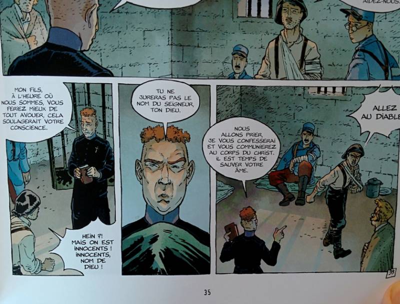 On proposait l'assistance de prêtres aux condamnés pour aborder leurs derniers instants. Etaient-ils tous obtus et sectaires comme celui qui est mis en scène dans cette reconstitution ? Les auteurs ont peut-être fait un peu de zèle pour rendre plus dramatique le sort de ce soldat injustement condamné. En 1914 l'église obéit ou pour le moins ne s'oppose pas aux injustices qui frappent les combattants mais ne se manifeste pas par un zèle dans l'oppression.