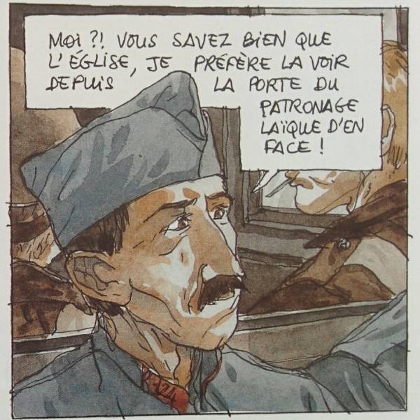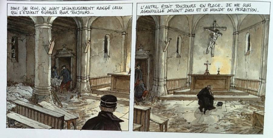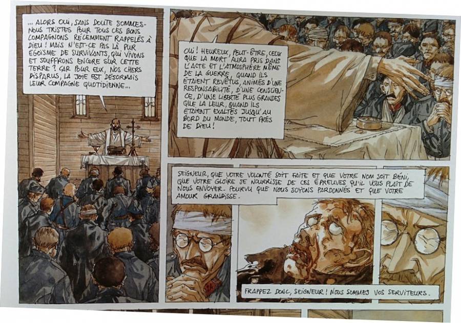 Image très forte que cette église dévastée qui sert de morgue et ce Christ abîmé, désaxé de sa croix. cette scène évoque la détresse d'un jeune officier confronté à la réalité de la guerre. Le décor est à l'image de ce que le personnage ressent. Ses valeurs, croyances, certitudes sont mises à mal. Il est en quête de réconfort et de repères pour affronter son quotidien. Beaucoup de soldats étaient pratiquants. La BD occulte souvent ce rôle de la religion dans les consciences des combattants. Elle préfère souvent montrer l'autre face, celle du doute et de l'abandon des croyances devant les réalités de la guerre. Cette tendance est marquée avec une génération d'auteurs comme Jacques Tardy qui dénnonçent un certain ordre social ou la religion joue un rôle politique.