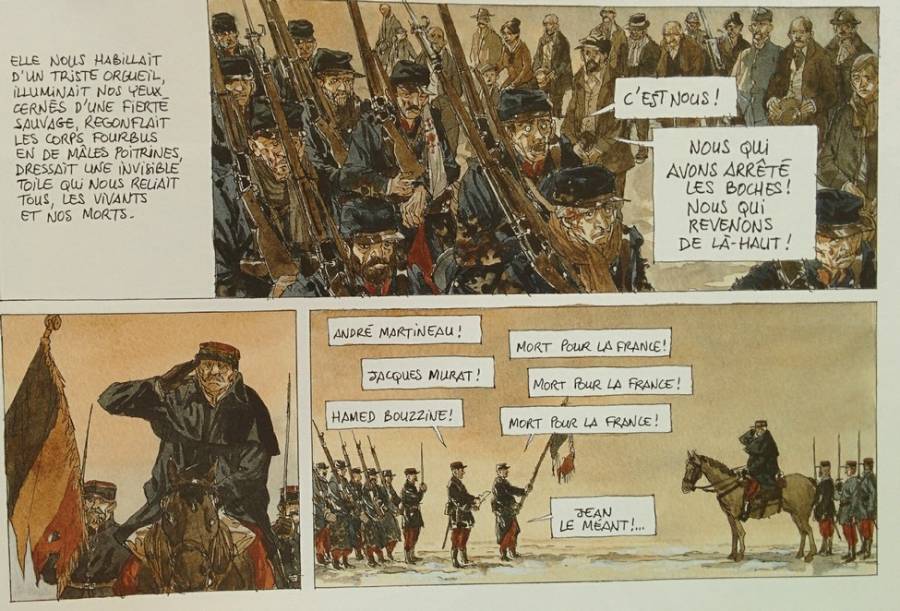 Les bandes dessinées moins récentes débutent souvent par la mobilisation. On met en scène l'enthousiasme des futurs combattants tel qu'on le perçoit aujourd'hui dans quelques clichés d'époque avec les défilés et les départs en train. Il y a quelques années les auteurs étaient plus pressés de dénoncer la guerre. Il s'agissait de montrer (car le lecteur connait l'Histoire de France) l'inconséquence, les illusions de ceux qui avaient choisi la guerre. Le peuple aurait été crédule, prêt à obéir et assez idiot pour en rajouter et se prêter au jeu. L'effet dramatique est ainsi garanti, le lecteur perçoit tous ces jeunes mobilisés euphoriques comme des morts en sursis. (voir Mattéo la scène du maire du village euphorique avec son fils en uniforme de conscrit)