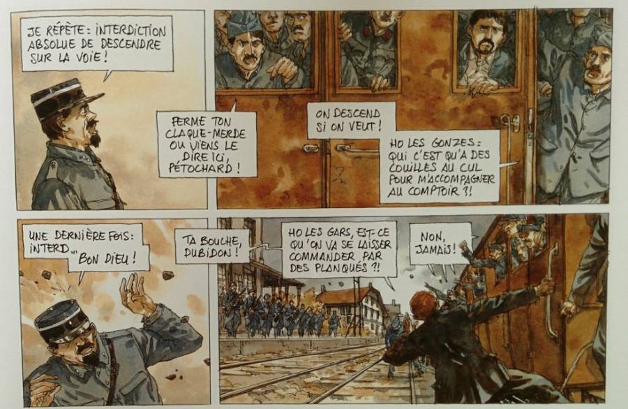 Une scène particulièrement bien vue de la part de nos auteurs, nous montre qu'un des rares permissionnaires rebelles qui avait exprimer sa colère sur le plan politique, après une dernière hésitation, abandonne son chiffon rouge et rejoint la majorité de ses compagnons dans la fraternisation avec les civiles. Scène très révélatrice sur le plan historique des motivations et des états d'âme des combattants dans les mutineries.