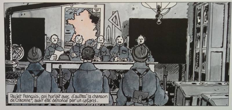 Scène de conseil de guerre très réaliste à porter entièrement au crédit de l’auteur. Cependant nous remarquons que Tardy place sa scène de façon non innocente dans les locaux d’une école. L’école primaire est dans notre référentiel républicain (pour ne pas dire dans notre inconscient collectif) le symbole de la république. L’école obligatoire a été instaurée avec l’avènement de la troisième république. Tardy nous montre une situation où les soldats jugés sont infantilisés, ramenés à leur condition d’enfants de la république en situation d’être punis. Ces images font écho à celles que nous avons relevées dans son autre album « Adieu Brindavoine » où le personnage principal rêve d’une république incarnée en statue de Marianne, effigie maternelle qui le poursuit avec agressivité pour lui reprocher son manque de combativité et de patriotisme.