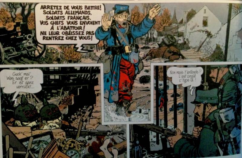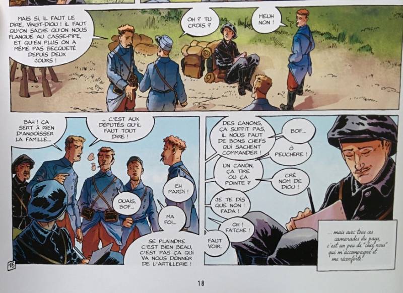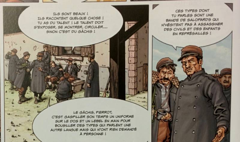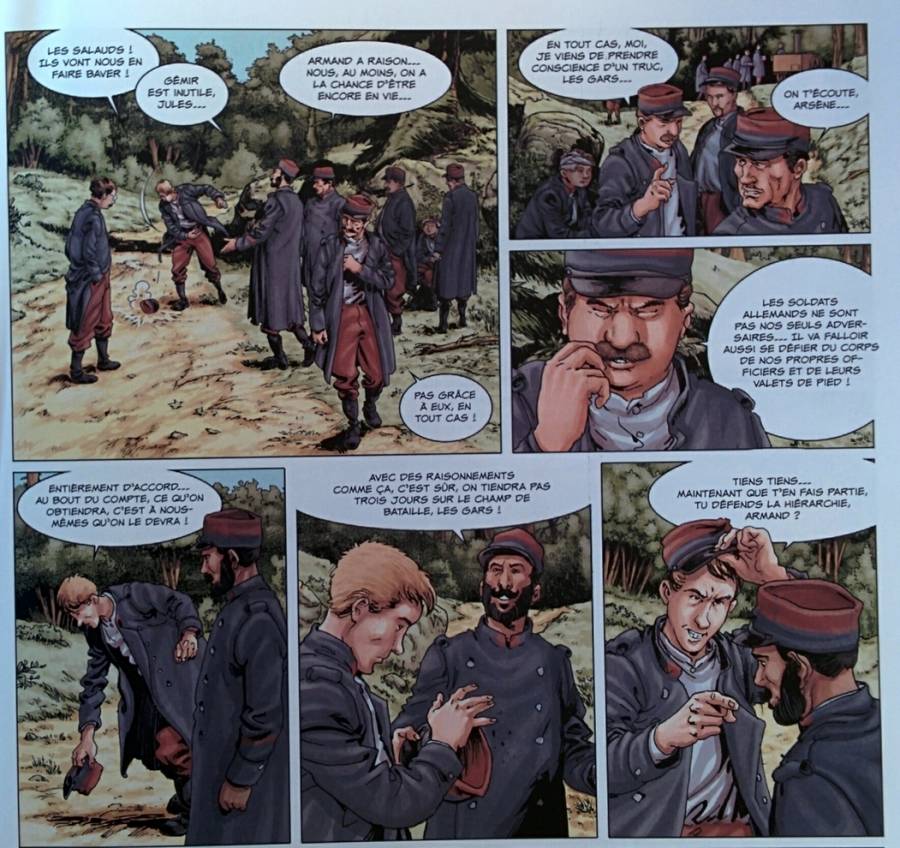 Deux discours s'opposent parmi les combattants, ceux qui dénoncent la guerre et ceux qui adhèrent aux thèses officielles présentant les allemands comme des ennemis dangereux pour les français. Cet album a le mérite de nous montrer cette diversité parmi les combattants, on retrouve les clivages de la société de 1914. Un cliché longtemps véhiculé par le discours officiel, nous montrait les combattants comme un groupe homogène regroupé derrière le label “poilus”.