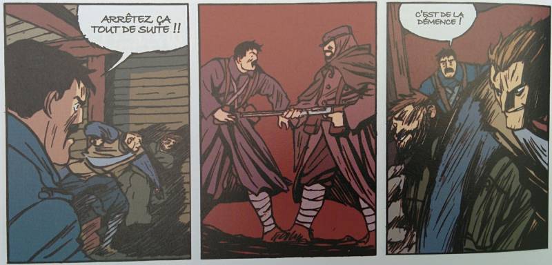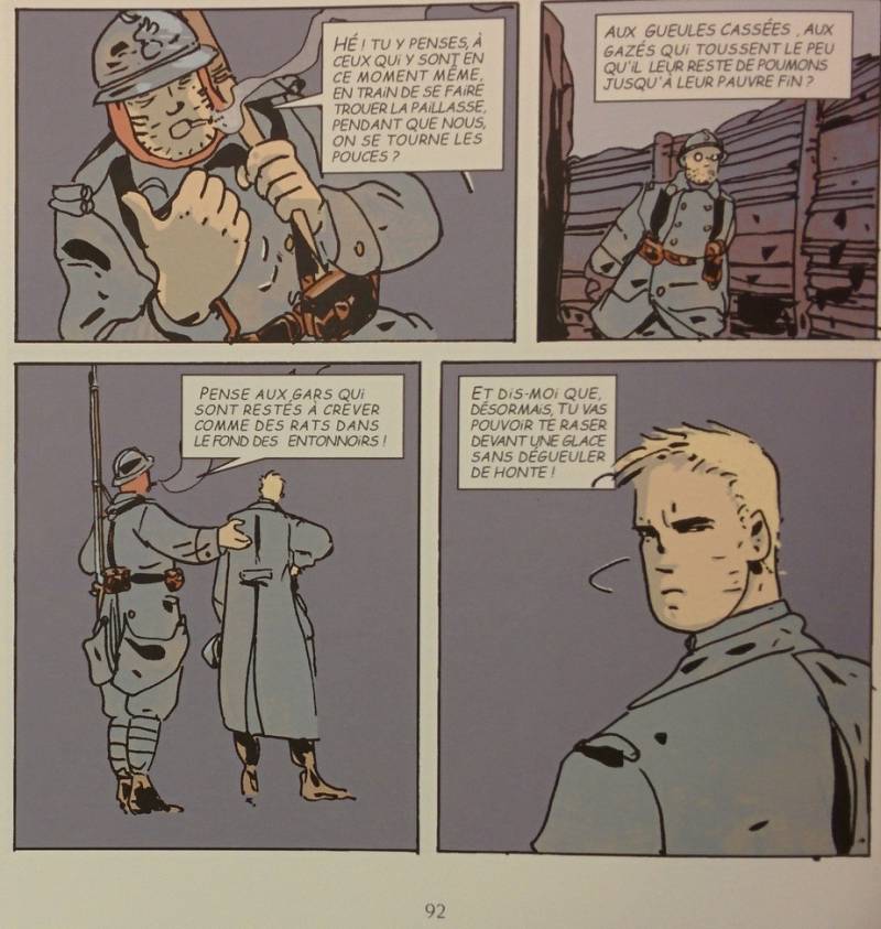 Nous retrouvons la culpabilité comme contrainte sur le mental des combattants, pour les inciter à obéir et accepter leur condition. Voir Larcenet Ligne de front où un officier stigmatise les déserteurs qui vont être fusillés. Idem Mauvais genre de Chloé Cruchaudet … Cette culpabilité est aussi transmise entre les combattants comme ici.