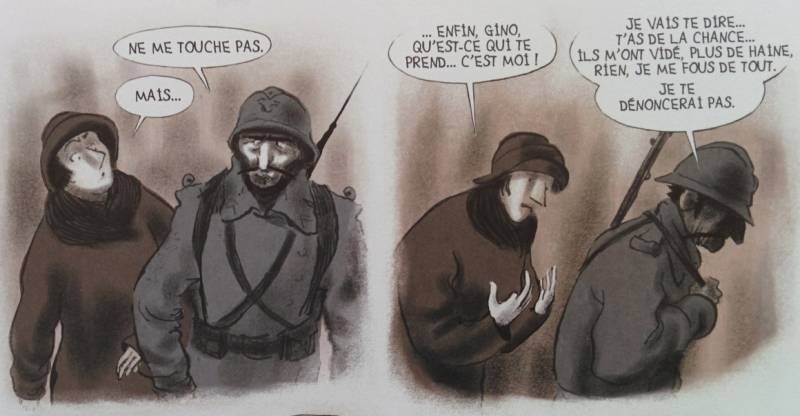 On retrouve tout le talent de Tardy qui dessine son personnage encadré dans une parfaite symétrie par de 2 soldats allemands à gauche et par 2 soldats français à droite. Des 2 cotés on réagit avec les mêmes mots prononcés dans sa langues d'origine. L'opposition n'est pas ici entre les français et les allemands mais entre les non violents et ceux qui participent à la guerre.