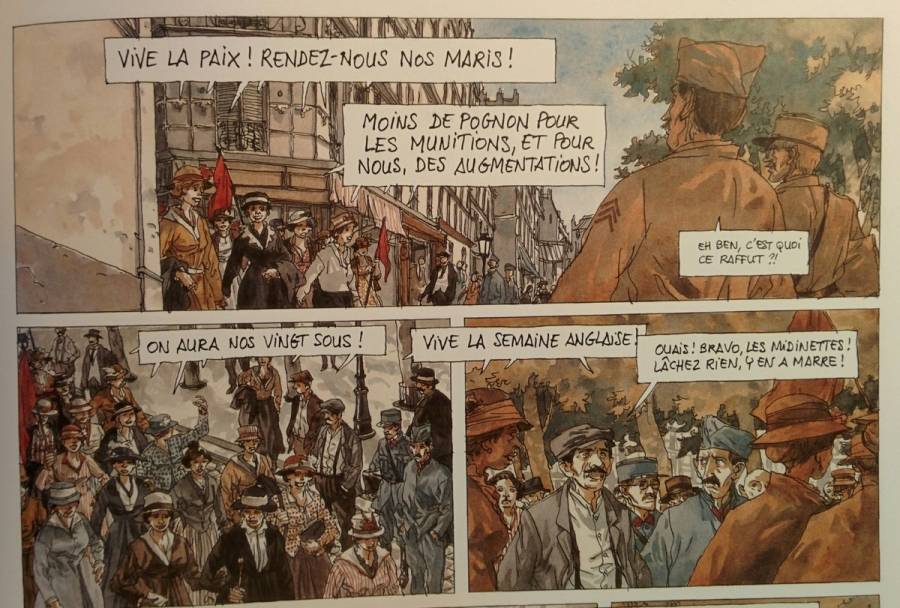 Ci-avant l'évocation de mouvements sociaux à l'arrière. Ces revendications féministes et salariales s'inscrivent dans une société qui est en pleine évolution avec le bouleversement des mœurs et usages liés à la guerre. Les auteurs nous montrent aussi des combattants en permission qui ne comprennent par forcément ces revendications. Ils les interprètent comme des trahisons à leur égard, eux qui n'ont d'autre choix que l'obéissance.