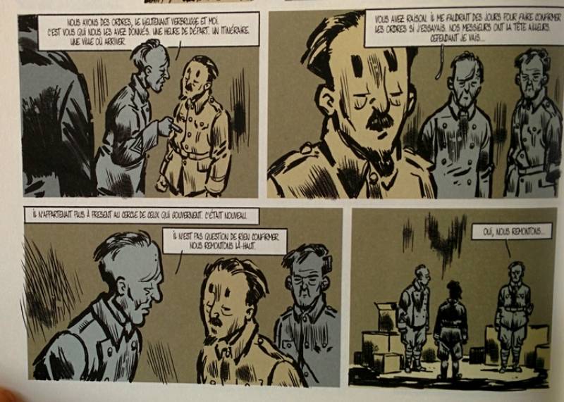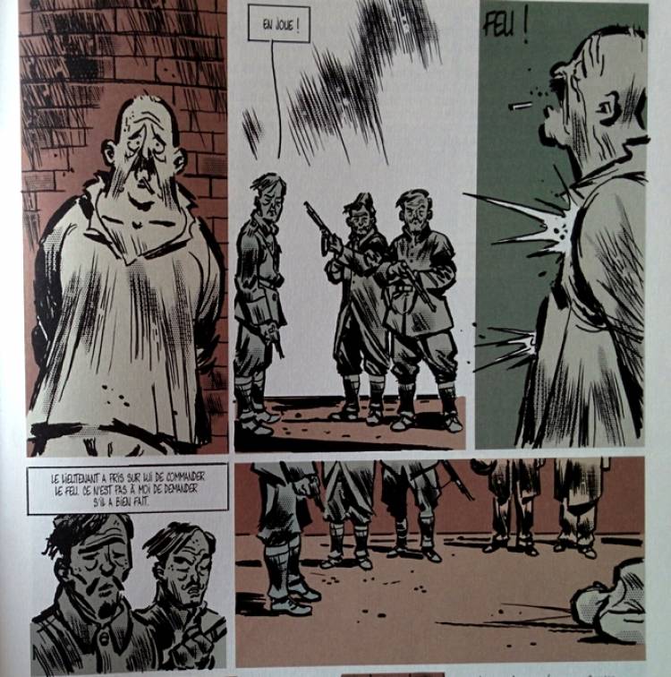 Ici Bruno Lefloch nous montre que les combattants ont pu faire aussi sans chef et assumer des décisions lourdes de conséquences. On ne sera pas étonné car tout au long de son histoire il ne manque pas de montrer les manques et l'inefficacité de la chaîne de commandement. Nous assistons à une scène où des soldats du rang sont placés devant un choix, éliminé ou non un prisonnier allemand. C’est par un échange argumenté, que les soldats vont décider de l’avenir du soldat allemand. Le héros propose à ses camarades de changer leur regard sur cet ennemi. Il le grime en soldat français pour leur faire prendre conscience son humanité.
