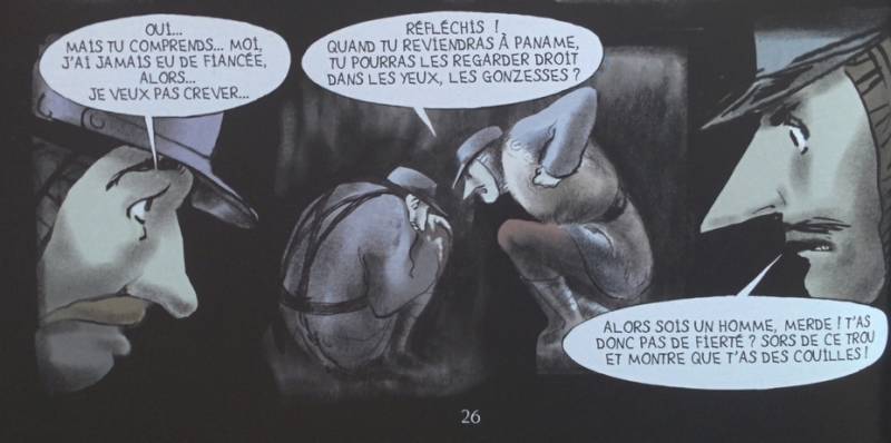 Comme on l'a déjà vu dans cet album, l'auteur va à l'encontre du cliché selon lesquels les combattants aguerris ne faisaient pas de zèle, ou pour le moins n'étaient pas volontaires. Paradoxalement c'est l'officier supérieur qui aimerait bien annuler cette mission puisque qu'il a trouver un prétexte .Et ce sont les deux subordonnés qui insistent pour le maintien de la mission en discréditant les arguments qui pourraient l'entraver.